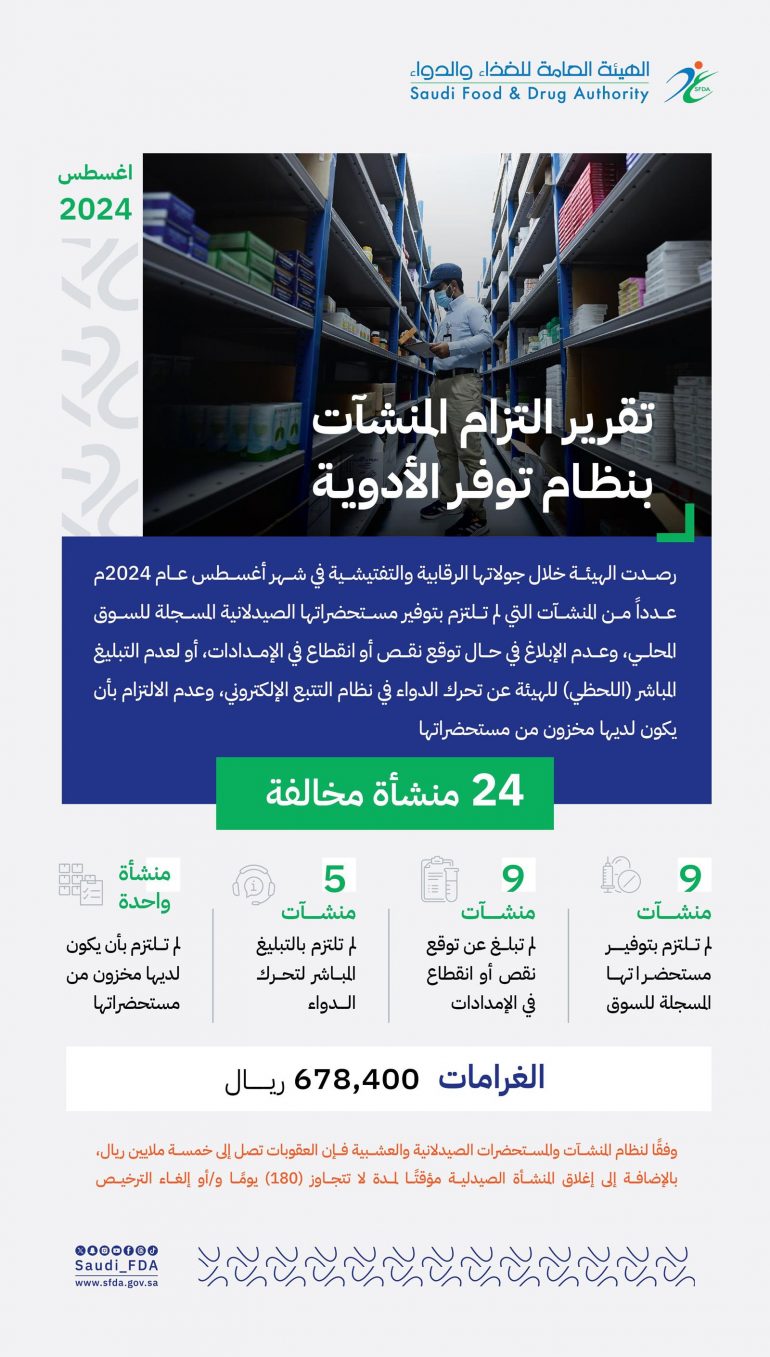 رصدت الهيئة العامة للغذاء والدواء (24) مخالفة على منشآت صيدلية لعدم التزامها بتوفير المستحضرات المسجلة لديها في السوق المحلي، وعدم تبليغها المباشر (اللحظي) للهيئة عن تحرك الدواء في نظام التتبع الإلكتروني، أو توقع نقص أو انقطاع في الإمدادات، وعدم توفر المخزون من مستحضراتها.