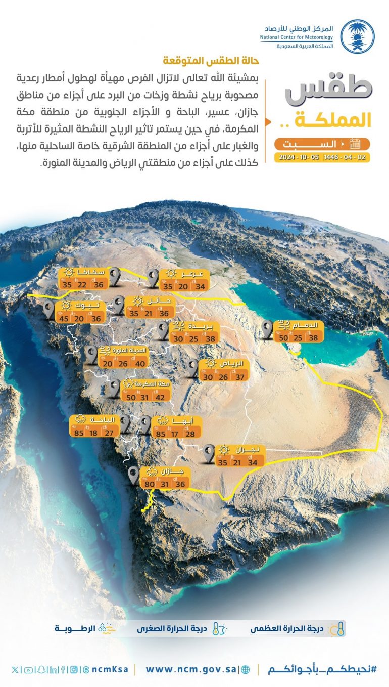 توقع المركز الوطني للأرصاد في تقريره عن حالة الطقس لهذا اليوم -بمشيئة الله تعالى- أجواء حارة بمكة المكرمة والمدينة المنورة، مع استمرار الفرصة لهطول أمطار رعدية مصحوبة برياح نشطة وزخات من البرد على أجزاء من مناطق جازان وعسير والباحة والأجزاء الجنوبية من منطقة مكة المكرمة، في حين يستمر تأثير الرياح النشطة المثيرة للأتربة والغبار على أجزاء من المنطقة الشرقية، خاصة الساحلية منها، كذلك على أجزاء من منطقتي الرياض والمدينة المنورة.