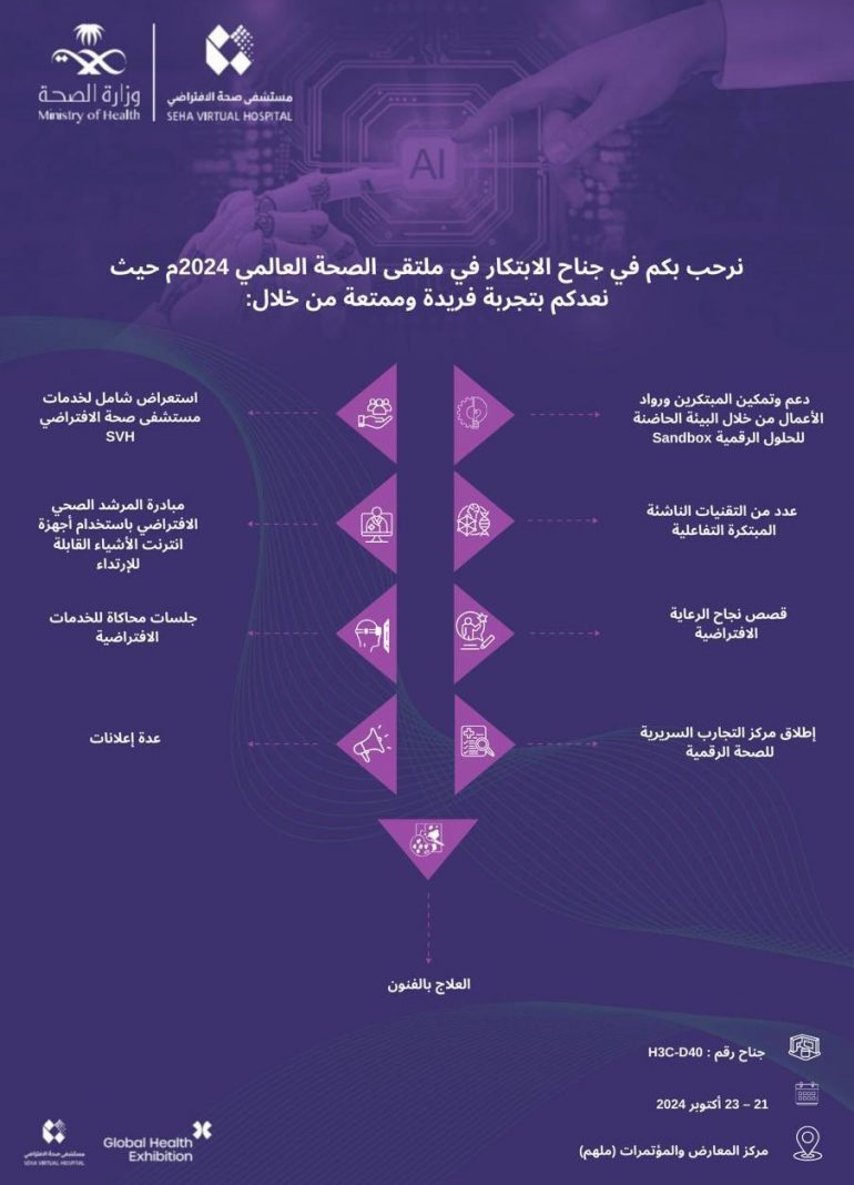 عبر جناح الابتكار، يشارك مستشفى صحة الافتراضي ومركز تمكين الابتكار في ملتقى الصحة العالمي 2024، الذي يقام برعاية معالي وزير الصحة الأستاذ فهد بن عبدالرحمن الجلاجل في مركز الرياض للمعارض والمؤتمرات “ملهم” خلال الفترة من 21 إلى 23 أكتوبر 2024.