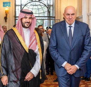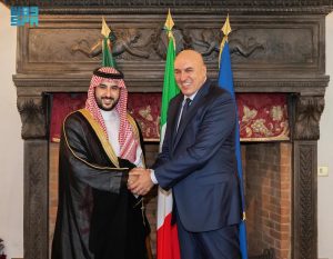 ثم عقد سمو وزير الدفاع ومعالي وزير الدفاع الإيطالي اجتماعًا ثنائيًا موسعًا بحضور وفدي الوزارتين، جرى خلاله استعراض العلاقات السعودية الإيطالية، وبحث آفاق التعاون الثنائي في المجال الدفاعي وسبل تعزيزه وفرص تطويره؛ بما يحقق تطلعات قيادتي البلدين الصديقين.