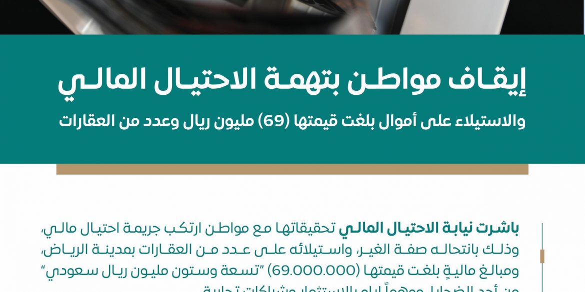 باشرت نيابة الاحتيال المالي تحقيقاتها مع مواطن ارتكب جريمة احتيال مالي، وذلك بانتحاله صفة الغير، واستيلائه على عدد من العقارات بمدينة الرياض، ومبالغ ماليةٍ بلغت قيمتها (69.000.000) “تسعة وستون مليون ريال سعودي” من أحد الضحايا، موهماً إياه بالاستثمار وشراكات تجارية.