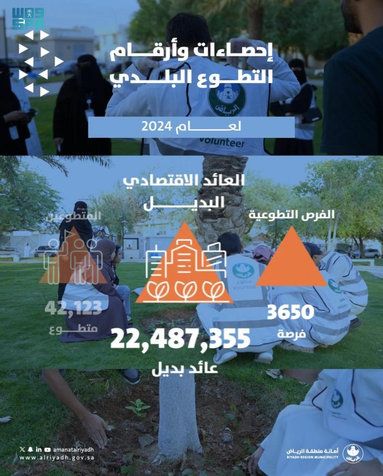 كشفت أمانة منطقة الرياض عن إنجازاتها في مجال العمل التطوعي خلال عام ٢٠٢٤م، امتدادًا لالتزامها بتعزيز ثقافة التطوع ودعم المشاركة المجتمعية بصفته جزءًا من إستراتيجيتها لتحقيق التنمية المستدامة، وقد وفرت الأمانة ٣٦٥٠ فرصة تطوعية متنوعة أسهمت في استقطاب ٤٢.١٢٣ متطوعًا، الذين قدموا ما مجموعه ٨١٨.٧٩٩ ساعة تطوعية.