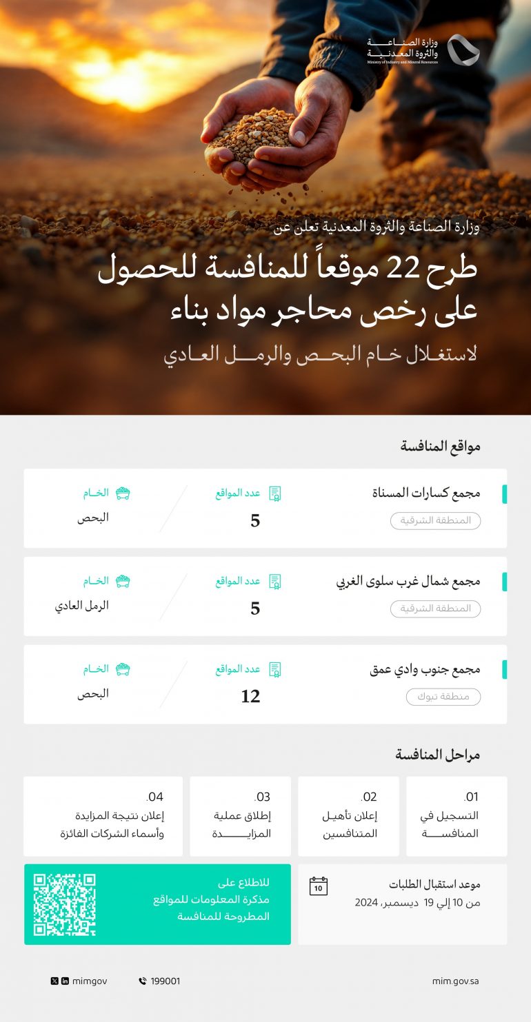 أعلنت وزارة الصناعة والثروة المعدنية طرح 22 موقعًا للمنافسة للحصول على رخص محاجر مواد البناء، لاستغلال خامي البحص والرمل العادي في المنطقة الشرقية ومنطقة تبوك.