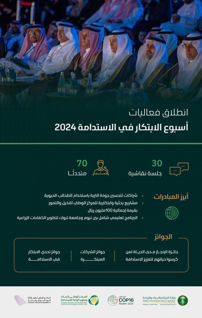 وتعد فعاليات النسخة الأولى من أسبوع الابتكار في الاستدامة حدثًا غير مسبوق حيث تتاح للحضور الفرصة للمشاركة في أكثر من (30) جلسة تضم (70) متحدثًا يمثلون الخبرات من جميع أنحاء العالم؛ لمناقشة أبرز التحديات البيئية والزراعية والمائية وطرح حلول مبتكرة تدعم تحقيق الأهداف الوطنية الطموحة.