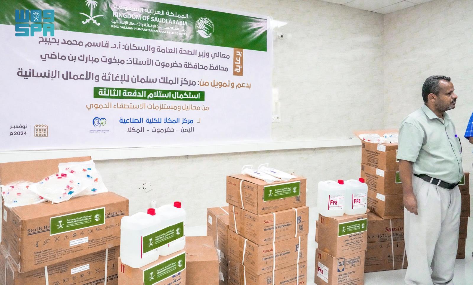 سلّم مركز الملك سلمان للإغاثة والأعمال الإنسانية أمس الأول، الدفعة الثالثة من محاليل ومستلزمات الاستصفاء الدموي لمركز المكلا للكلية الصناعية في ساحل حضرموت.