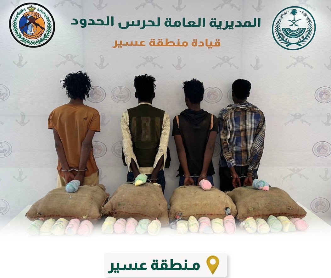 كما قبضت الدوريات البرية لحرس الحدود في قطاع الربوعة بمنطقة عسير على “4” مخالفين لنظام أمن الحدود من الجنسية الإثيوبية؛ لتهريبهم “80” كيلوجرامًا من نبات القات، وجرى استكمال الإجراءات النظامية الأولية بحقهم، وتسليمهم والمضبوطات لجهة الاختصاص.
