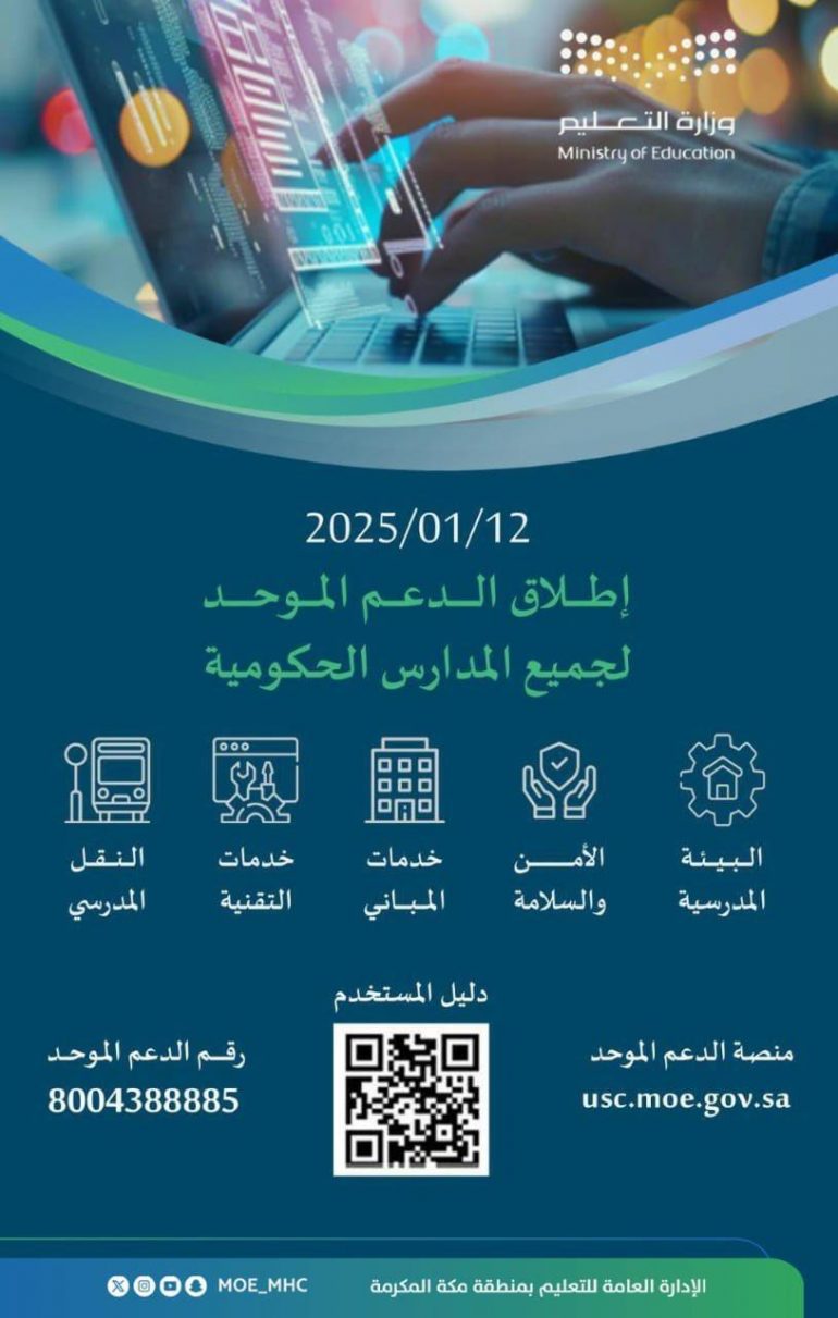 أطلق تعليم منطقة مكة المكرمة اليوم, نظام الدعم الموحد في جميع المدارس الحكومية بالمنطقة الذي أقرته وزارة التعليم من أجل رفع طلبات الدعم والبلاغات، ومراقبة الأداء، والرفع من مستوى الجودة؛ لضمان استمرارية العمل في جميع الأوقات, حيث سيحدث النظام نقلة نوعية في الخدمات المقدمة للمستفيدين، للإسهام في تقديم الدعم والخدمات التقنية الإدارية والتعليمية من خلال تطبيق واحد.