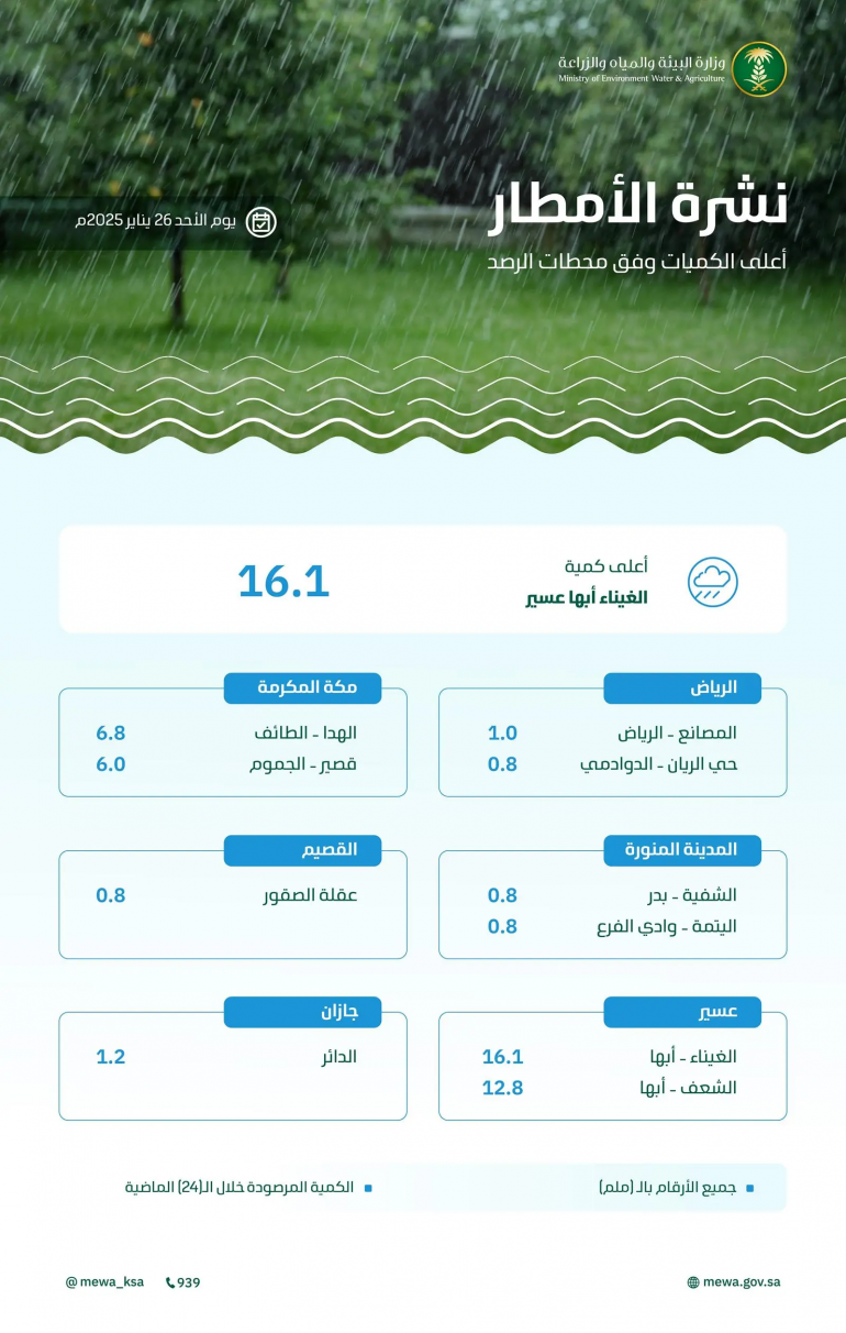 أفاد التقرير اليومي الصادر عن وزارة البيئة والمياه والزراعة حول كميات هطول الأمطار في مناطق المملكة كافة، خلال الفترة من الساعة التاسعة صباح السبت 25 يناير حتى التاسعة صباح يوم الأحد 26 يناير 2025م، بتسجيل محطة الغيناء بأبها في منطقة عسير أعلى كمية لهطول الأمطار بـ(16.1) ملم، وذلك ضمن (7) مناطق في المملكة شهدت كميات متفرقة من الأمطار خلال الـ24 ساعة الماضية.
