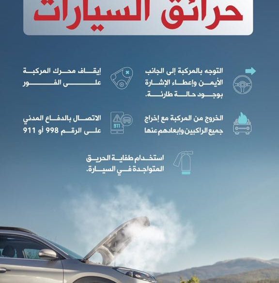 وأوضحت المديرية العامة، أن في حال وقوع حريق في السيارة، التوجه بالمركبة إلى الجانب الأيمن وإعطاء الإشارة بوجود حالة طارئة، وإيقاف محرك المركبة فورًا، والخروج من المركبة مع إخراج جميع الراكبين وإبعادهم عنها، واستخدام طفاية الحريق الموجودة في السيارة.
