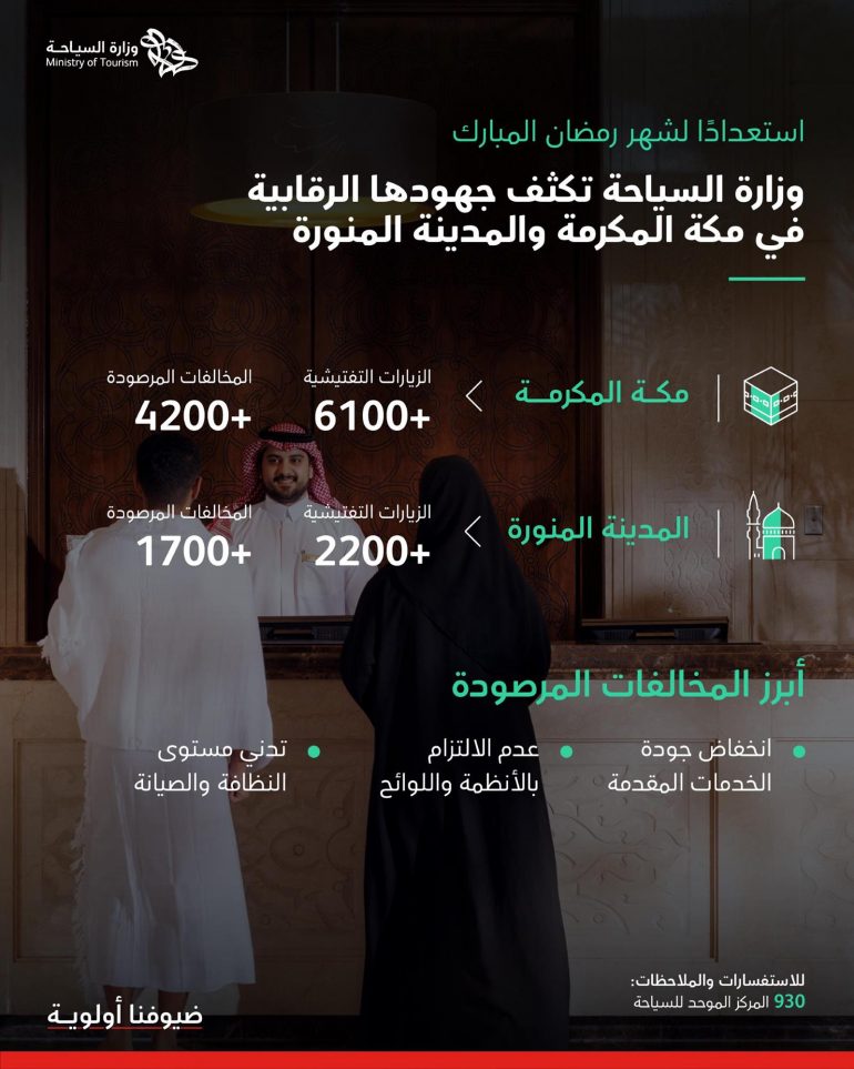 واصلت وزارة السياحة، جولاتها الرقابية المكثفة على مرافق الضيافة بمختلف أنواعها من “فنادق وشقق فندقية وغيرها”، والأنشطة السياحية في مكة المكرمة والمدينة المنورة، وذلك ضمن حملة “ضيوفنا أولوية”، بهدف ضمان جودة الخدمات المقدمة للزوار، وذلك استعدادًا لموسم العمرة خلال شهر رمضان المبارك، وتأتي هذه الجهود الرقابية بتوجيه ومتابعة معالي وزير السياحة الأستاذ أحمد بن عقيل الخطيب.