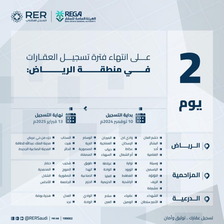 وبينت “الهيئة” أنّ التسجيل العيني للعقار سينتهي في الأحياء التالية بمدينة الرياض: “جزء من حي عريض، وادي لبن، مدينة الملك عبدالله للطاقة، الوسام، السحاب، المرجان، البشائر، الإسكان، البرية، المدينة الصناعية الجديدة، هيت، خشم العان، أُحد، عكاظ، ديراب، المنصورية، الحائر، العماجية، الغنامية، أم الشعال، السهباء والمصفاة”، وفي محافظة المزاحمية ينتهي التسجيل في الأحياء التالية : “وسيلة، نوارة، غرناطة، طويق، شخيب، حضار، الياسمين، الورود، الواحة، الهدا، المروج، المحمدية، اللؤلؤة، الغطغط، العليا، الصناعية، الصقورية، الشلال، الريف، الراشدية، الحزيمية، الحزم، الجامعة، الأندلس ومشيرفة”، كما سينتهي التسجيل بالأحياء التالية في محافظة الدرعية: “الشهداء، عقرباء، سلام، الوادي، العدل، نجد، العين، الوصيل، الأمير سلطان، الواحة، هجرة بوضة”.