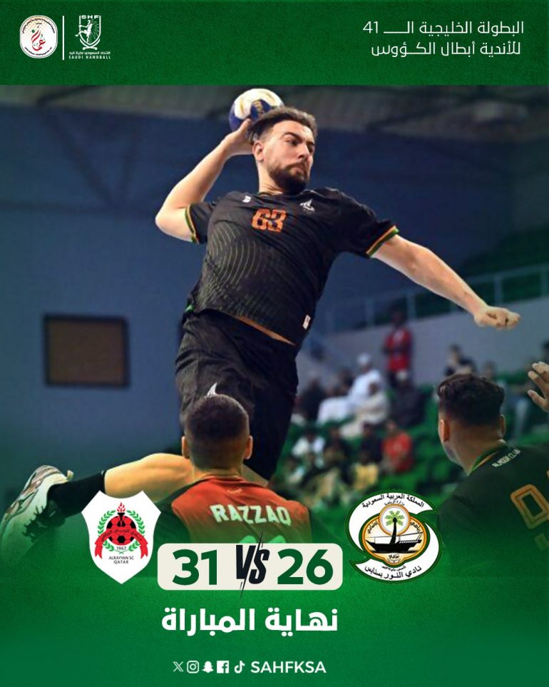خسر فريق النور السعودي أمام الريان القطري بنتيجة 31-26 خلال المواجهة التي جمعتهما أمس في أولى مبارياته ضمن البطولة الخليجية الـ41 لأندية أبطال الكؤوس لكرة اليد، المقامة حاليًا في العاصمة العمانية مسقط، وتستمر حتى 24 فبراير الجاري.