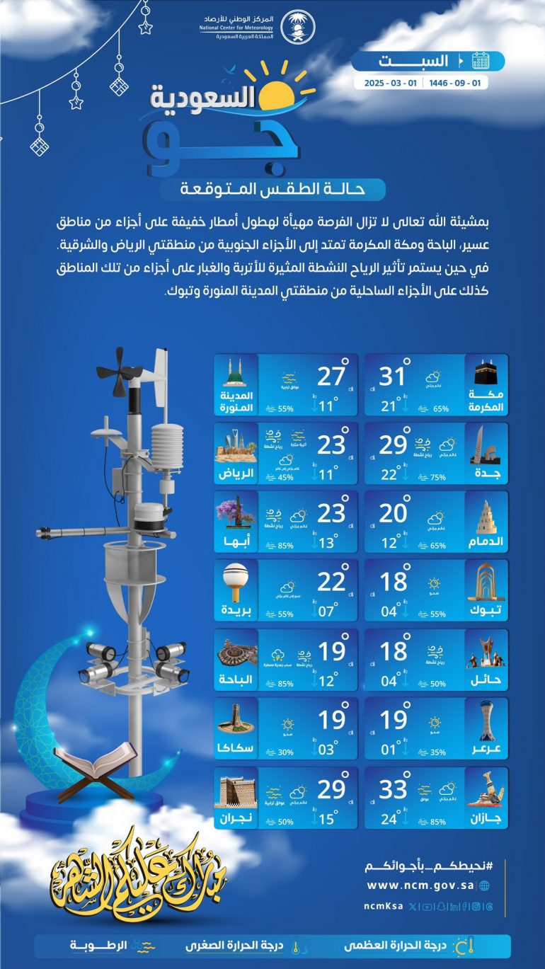 توقع المركز الوطني للأرصاد في تقريره عن حالة الطقس اليوم -بمشيئة الله تعالى- هطول أمطار خفيفة على أجزاء من مناطق عسير والباحة ومكة المكرمة والرياض والشرقية، في حين يستمر تأثير الرياح النشطة المثيرة للأتربة والغبار على أجزاء من تلك المناطق، كذلك على الأجزاء الساحلية من منطقتي المدينة المنورة وتبوك.