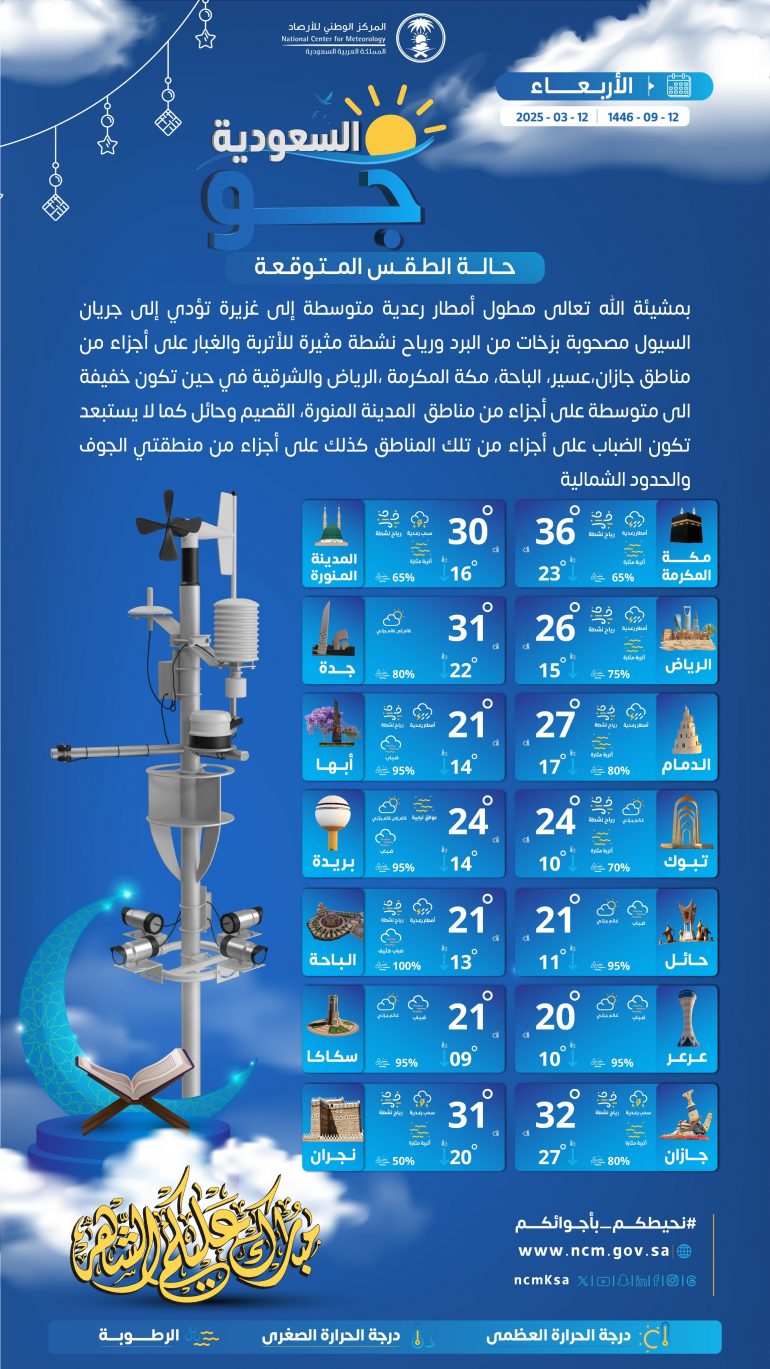 توقع المركز الوطني للأرصاد في تقريره عن حالة الطقس اليوم -بمشيئة الله تعالى– هطول أمطار رعدية متوسطة إلى غزيرة، تؤدي إلى جريان السيول ومصحوبة بزخات من البرد ورياح نشطة مثيرة للأتربة والغبار، على أجزاء من مناطق جازان وعسير والباحة ومكة المكرمة والرياض والشرقية، في حين تكون خفيفة إلى متوسطة على أجزاء من مناطق المدينة المنورة والقصيم وحائل، كما لا يستبعد تكون الضباب على أجزاء من تلك المناطق وأجزاء من منطقتي الجوف والحدود الشمالية.