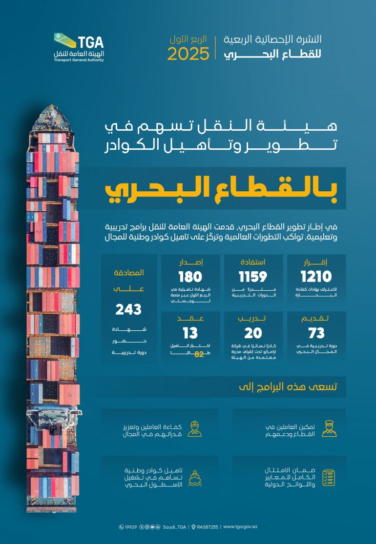 ضمن مبادراتها لتطوير الكفاءات البشرية ورفع جودة الأداء، أصدرت الهيئة العامة للنقل خلال الربع الأول من العام الجاري أكثر من 180 شهادة تأهيلية لمتدربين ومتدربات في القطاع البحري عبر منصة “لوجستي”.