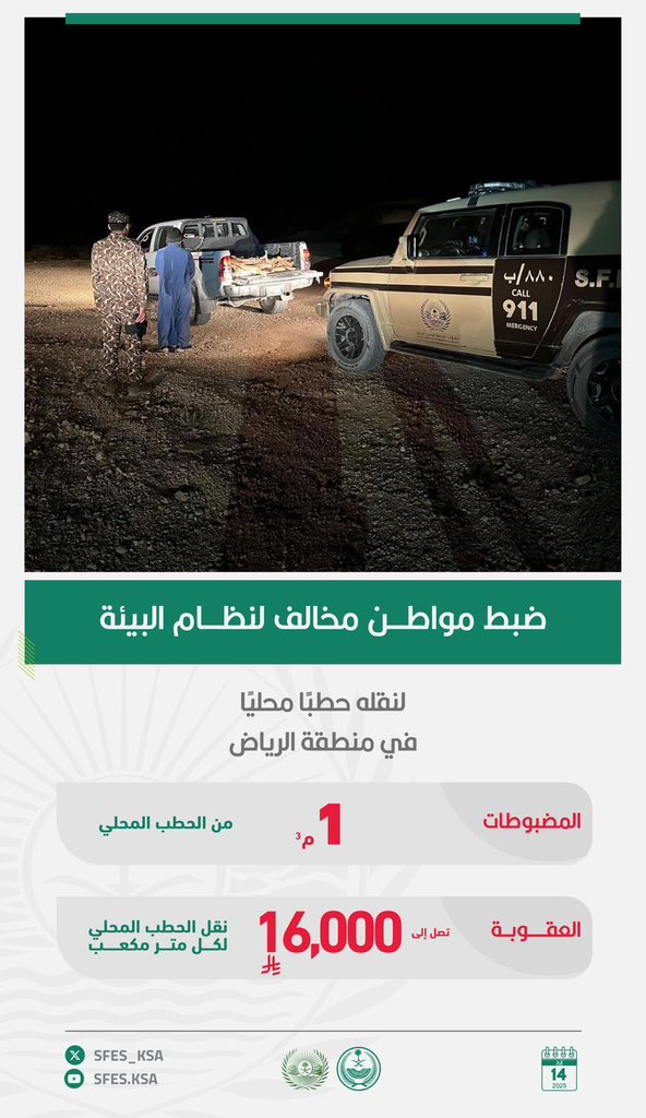 كما قبضت القوات الخاصة للأمن البيئي على مواطن مخالف لنظام البيئة لعدم الالتزام بتعليمات وإرشادات المحافظة على الغطاء النباتي بإشعال النار في غير الأماكن المخصصة لها بمنطقة حائل، وتم تطبيق الإجراءات النظامية بحقه.