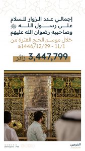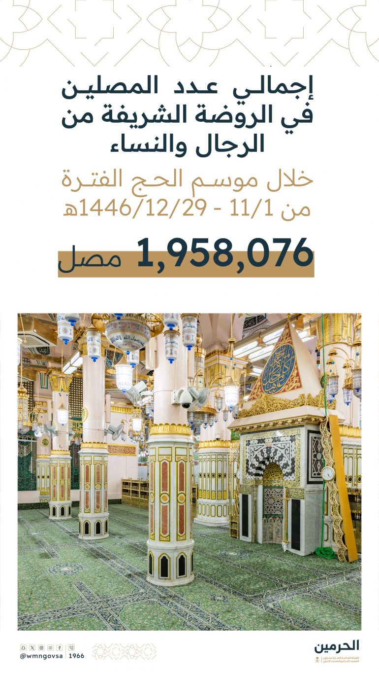 كشفت الهيئة العامة للعناية بشؤون المسجد الحرام والمسجد النبوي عن عدد المصلين في الروضة الشريفة بالمسجد النبوي خلال موسم حج 1446هـ، مبينة أنهم بلغوا 1,958,076 مصليًا من الرجال والنساء، خلال الفترة من 1 ذي القعدة حتى 29 ذي الحجة 1446هـ، كما بلغ عدد القادمين للسلام على الرسول الكريم محمد- صلى الله عليه وسلم- وصاحبيه أبي بكر الصديق وعمر بن الخطاب- رضي الله عنهما-، خلال الفترة ذاتها، 3,447,799 زائرًا.