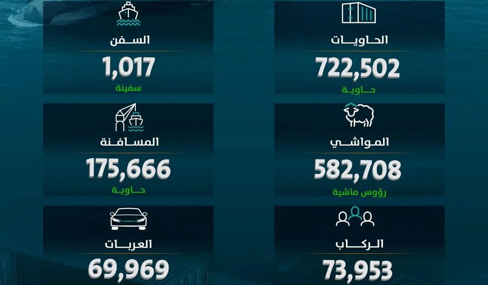 وسجّل إجمالي الطنيات المناولة “البضائع العامة، والبضائع السائبة الصلبة، والبضائع السائبة السائلة” ارتفاعًا بنسبة 2.81)%( لتصل إلى (21,180,445) طنًا مقارنة بـ(20,601,380) طنًا بالفترة المماثلة من العام الماضي، وبلغ إجمالي البضائع العامة (461,958) طنًا، والبضائع السائبة الصلبة (4,096,185) طنًا، والبضائع السائبة السائلة (16,622,302) طن، فيما استقبلت الموانئ (582,708) رؤوس ماشية، بارتفاع قدره 13.18)%( مقارنة بـ(514,864) رأس ماشية بالفترة نفسها من العام الماضي.