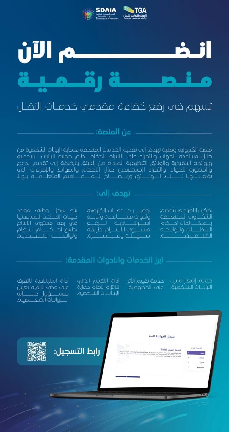 دعت الهيئة العامة للنقل مقدمي أنشطة النقل البري والسككي والبحري إلى التسجيل في منصة حوكمة البيانات الوطنية التابعة للهيئة السعودية للبيانات والذكاء الاصطناعي (سدايا) استنادًا إلى المادة (الثانية) من القواعد المنظمة للسجل الوطني، لبناء سجل وطني موحد لمتابعة التزام الجهات بأحكام نظام حماية البيانات الشخصية ولوائحه التنفيذية.