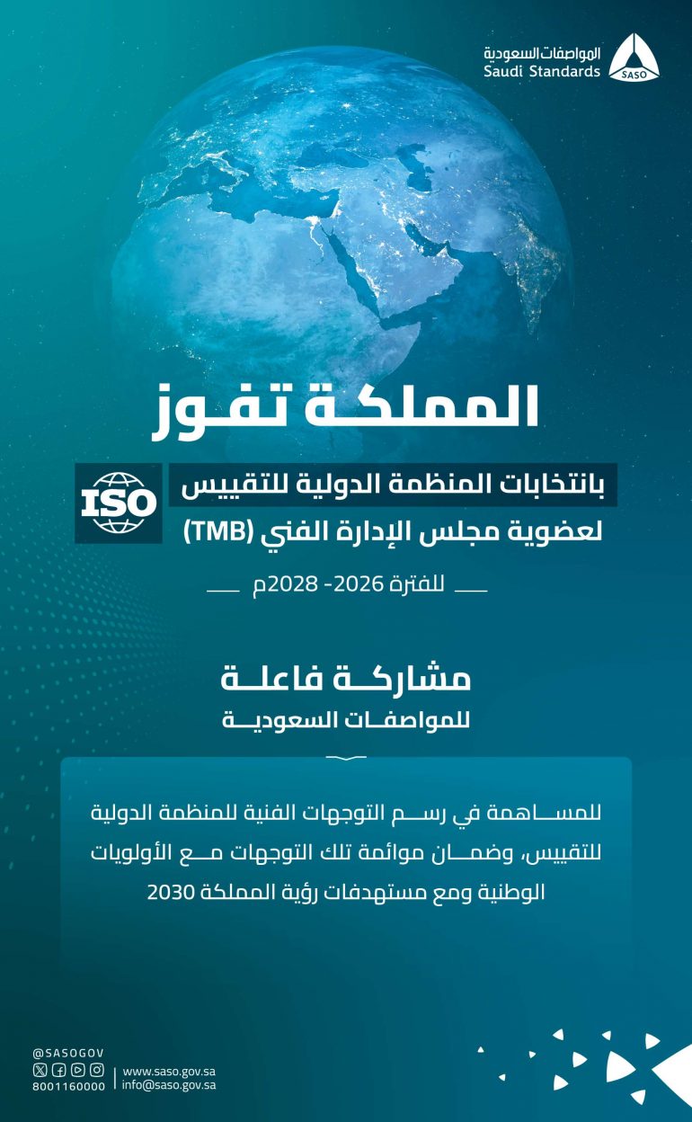 بما يعكس دور الهيئة السعودية للمواصفات والمقاييس والجودة الفاعل على الصعيد العالمي، فازت المملكة العربية السعودية ممثلة بالهيئة بعضوية مجلس الإدارة الفني للمنظمة الدولية للتقييس (ISO) للفترة 2026 – 2028م.