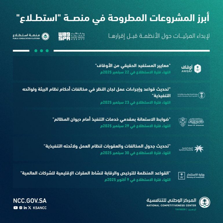 وشهدت المنصة، طرح وزارة البيئة والمياه والزراعة للنقل لمشروع “تحديث قواعد وإجراءات عمل لجان النظر في مخالفات أحكام نظام البيئة ولوائحه التنفيذية”, الذي تهدف من خلاله الوزارة؛ إلى تنظيم عمل اللجان والمهام الموكلة إلى أعضائها، وإلى تشكيل لجان اعتراضات للنظر في الاعتراضات من ذو الشأن، وتتيح المنصة الاستطلاع على المشروع إلى يوم 23 سبتمبر 2025م.