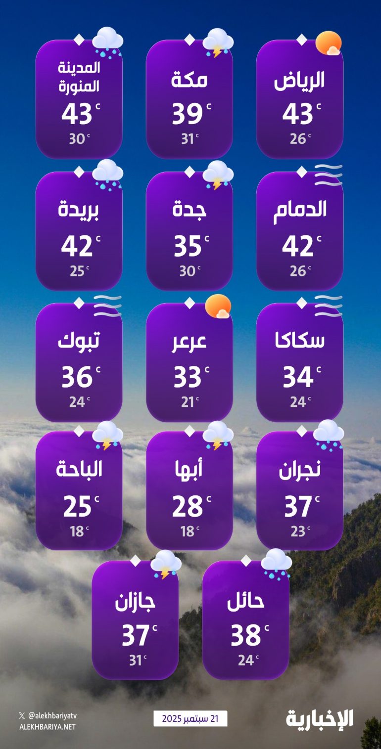 توقّع المركز الوطني للأرصاد في تقريره عن حالة الطقس اليوم -بمشيئة الله تعالى- هطول أمطار رعدية خفيفة مصحوبة برياح نشطة على أجزاء من مناطق الشرقية ونجران، الرياض، القصيم، حائل، ورعدية متوسطة إلى غزيرة، تؤدي إلى جريان السيول، مصحوبة بزخات من البرد ورياح نشطة مثيرة للأتربة والغبار على مناطق جازان وعسير والباحة ومكة المكرمة والمدينة المنورة، كما لا يستبعد تكوّن الضباب على تلك المناطق.