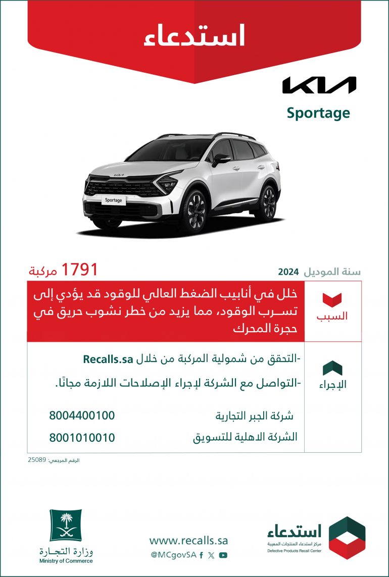 أعلنت وزارة التجارة استدعاء “1791” مركبة “KIA-Sportage” موديل 2024، لوجود خلل في أنابيب الضغط العالي للوقود، قد يؤدي إلى تسرب الوقود ويزيد من خطر نشوب حريق في حجرة المحرك.