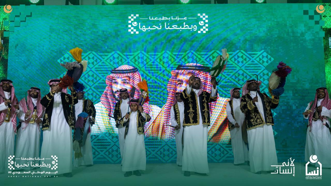 تلا ذلك فقرة ” عزّنا بطبعنا” من تقديم أبناء إنسان مستوحاة من شعار الهوية الرسمية لليوم الوطني السعودي الخامس والتسعين، ومحاكاة القيم الراسخة التي تنسجم مع قيم الجمعية، والتي تمثلت في الأصالة والكرم والجود والفزعة ورؤية الوطن وتجسيد الهوية الوطنية المتوارثة التي تشكل حاضر الوطن وتؤسس لمستقبله، وتعكس الهوية الوطنية والانجازات التي تحققت المستمدة من عراقة المجتمع وقيمه الراسخة.