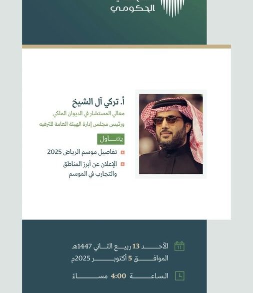 ينعقد المؤتمر الصحفي الحكومي يوم الأحد 5 أكتوبر 2025، الذي يستضيف معالي المستشار في الديوان الملكي، رئيس مجلس إدارة الهيئة العامة للترفيه الأستاذ تركي بن عبدالمحسن آل الشيخ؛ للحديث عن تفاصيل موسم الرياض 2025 والإعلان عن أبرز المناطق والتجارب في الموسم.