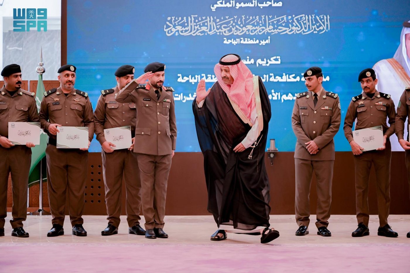 كرَّم صاحب السمو الملكي الأمير الدكتور حسام بن سعود بن عبدالعزيز أمير منطقة الباحة، في مكتبه اليوم، عددًا من ضباط وأفراد المديرية العامة لمكافحة المخدرات بالمنطقة، تقديرًا لما حققوه من إنجازات أمنية متميزة في أداء مهامهم.