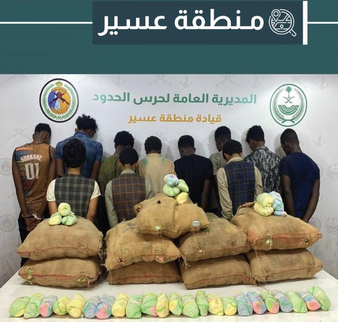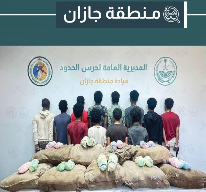 كما قبضت الدوريات البرية لحرس الحدود في قطاع الدائر بمنطقة جازان على (12) مخالفًا لنظام أمن الحدود من الجنسيتين اليمنية والإثيوبية، لتهريبهم (280) كيلوجرامًا من نبات القات المخدر، وجرى استكمال الإجراءات النظامية الأولية بحقهم، وتسليمهم والمضبوطات لجهة الاختصاص.