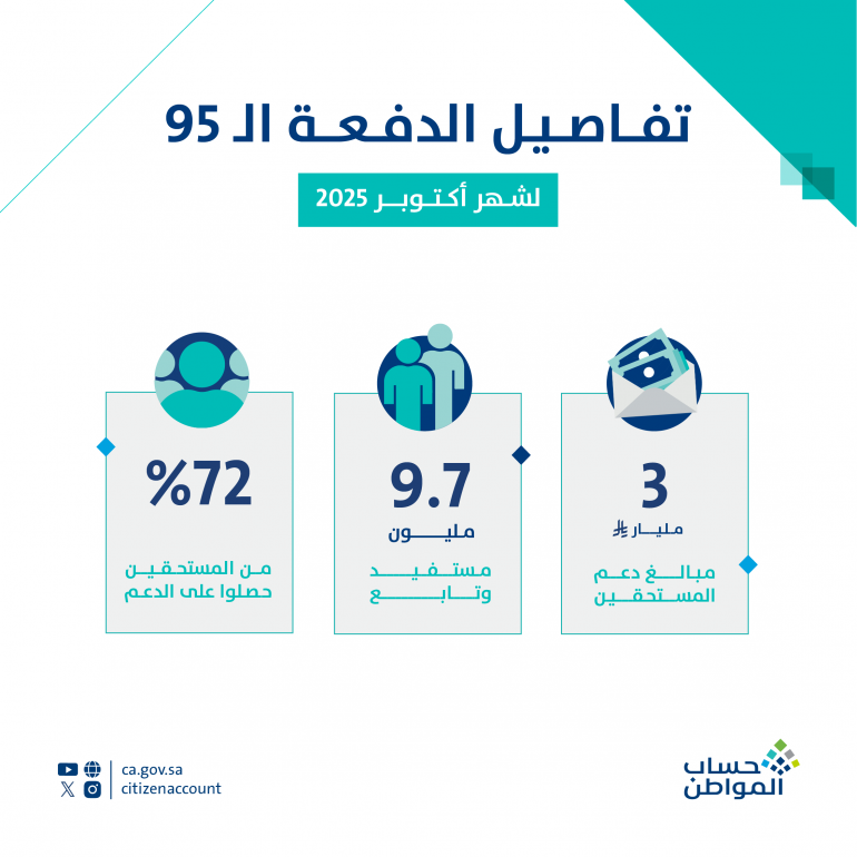 أودع برنامج حساب المواطن اليوم, 3 مليارات ريال مخصّص دعم شهر أكتوبر للمستفيدين المكتملة طلباتهم، حيث بلغ عدد المستفيدين المستوفين لمعايير الاستحقاق في الدفعة الخامسة والتسعين أكثر من 9.7 ملايين مستفيد وتابع.