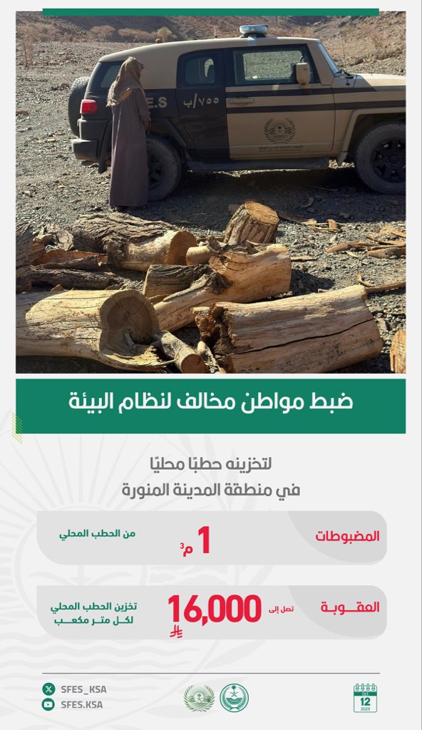 وأوضحت القوات أن عقوبة تخزين الحطب والفحم المحليين غرامة تصل إلى “16,000” ريال لكل متر مكعب، حاثةً على الإبلاغ عن أي حالات تمثل اعتداءً على البيئة أو الحياة الفطرية على الرقم “911” بمناطق مكة المكرمة والمدينة المنورة والرياض والشرقية، و “999” و “996” في بقية مناطق المملكة، وستعامل جميع البلاغات بسرية تامة دون أدنى مسؤولية على المبلّغ.