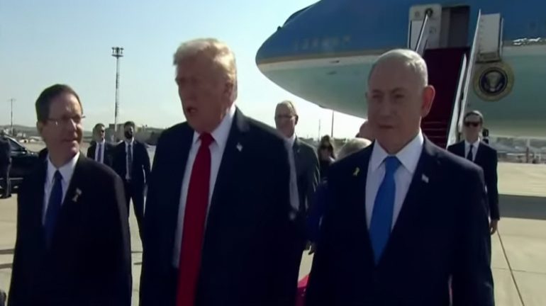 وصل الرئيس الأمريكي دونالد ترامب إلى إسرائيل اليوم الاثنين، وكان في استقباله بالمطار كل من رئيس إسرائيل إسحاق هرتسوغ ورئيس الوزراء بنيامين نتنياهو.