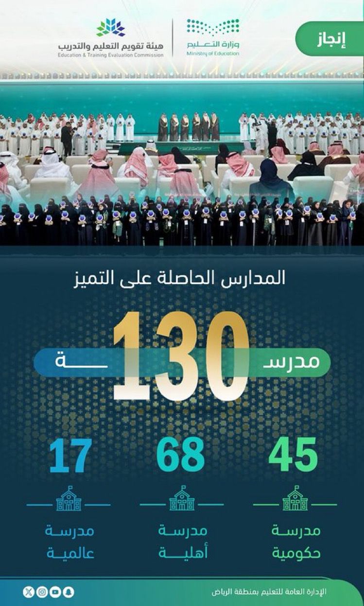 حققت 130 مدرسة من مدارس الإدارة العامة للتعليم بمنطقة الرياض مستوى “التميز” وفقاً لنتائج البرنامج الوطني للتقويم والتصنيف والاعتماد المدرسي.