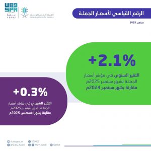 وبينت أن الرقم القياسي لأسعار الجملة في المملكة بلغ 2.1% خلال شهر سبتمبر 2025 مقارنةً بنظيره من عام 2024، في حين بلغ مؤشر أسعار الجملة على أساس شهري نسبة 0.3% في شهر سبتمبر 2025م مقارنةً بشهر أغسطس 2025.
