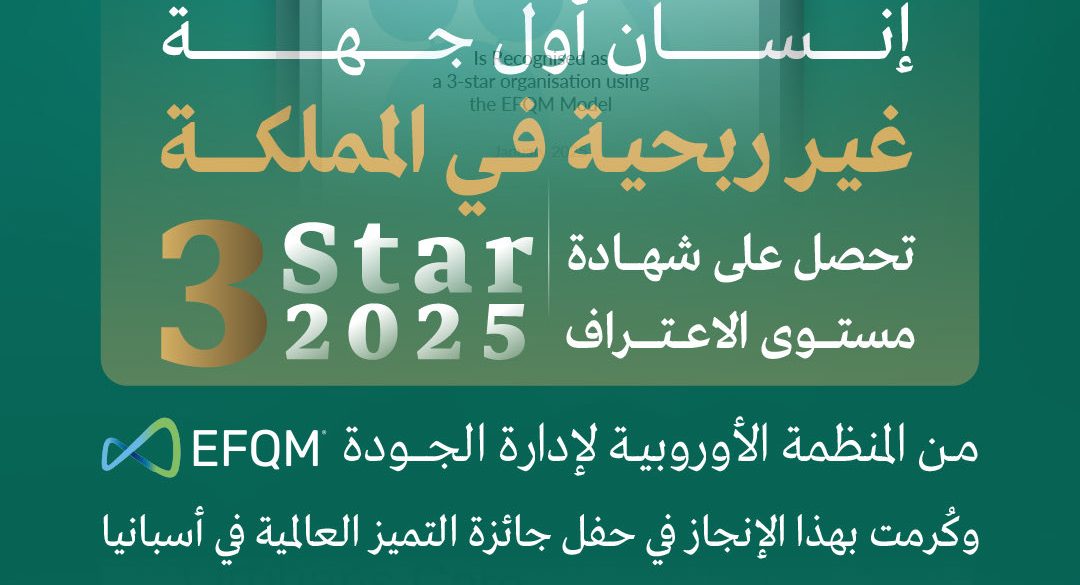 ويأتي هذا التكريم تقديرًا لدور الجمعية الريادي في تطبيق معايير التميّز المؤسسي والجودة الشاملة، وجهودها المستمرة في تحسين الأداء وتطوير الخدمات المقدمة للمستفيدين. حيث تعد إنسان المنظمة الغير ربحية الوحيدة بالمملكة الحاصلة على مستوى الاعتراف لإصدار 2025م.