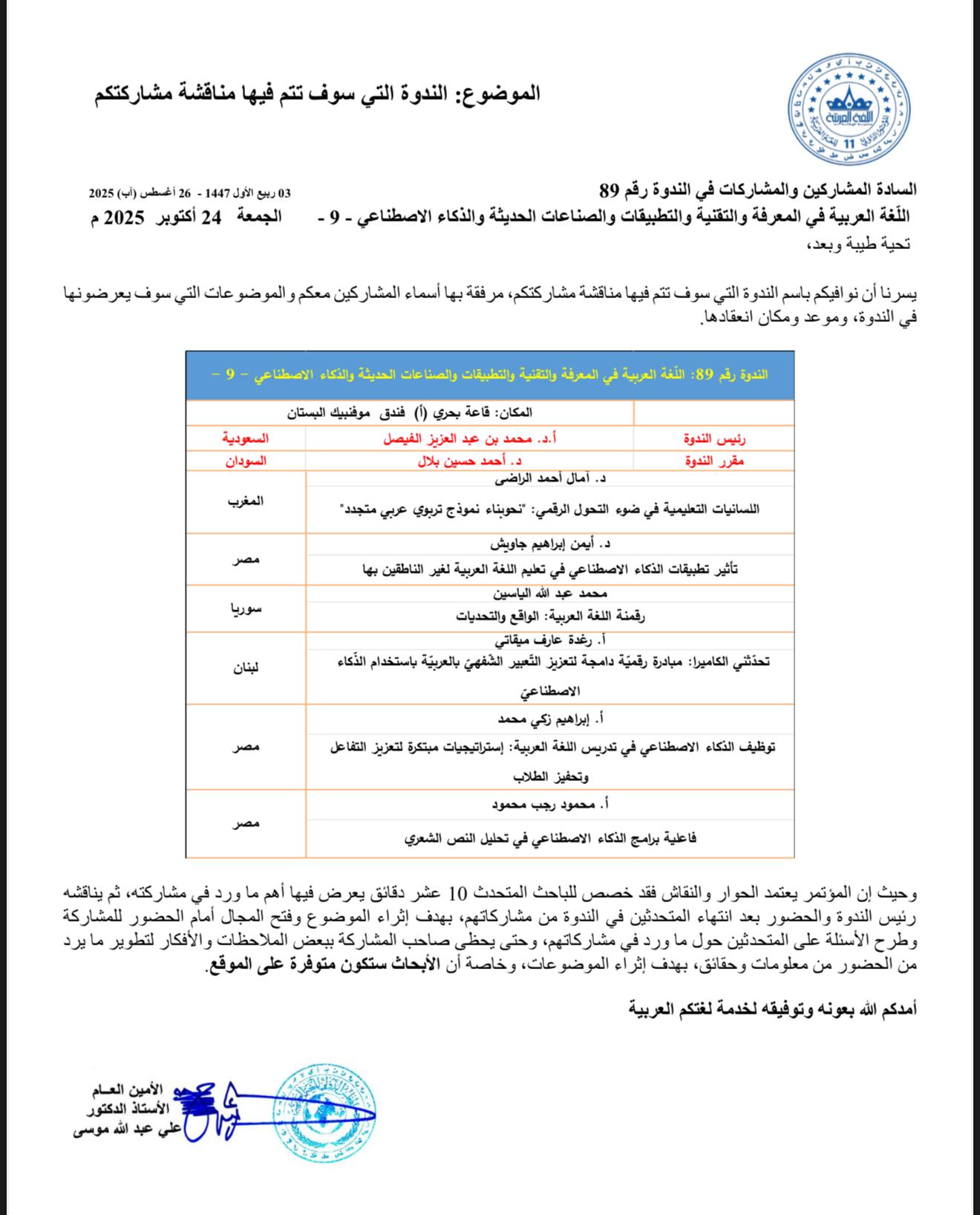 ويرأس جلسة: (اللغة العربية في المعرفة والتقنية والتطبيقات والصناعات الحديثة والذكاء الاصطناعي)، في المؤتمر الدولي للغة العربية الذي يعقد في مدينة دبي بدولة الإمارات العربية المتحدة خلال المدة من ٢١ إلى ٢٥ أكتوبر ٢٠٢٥م.