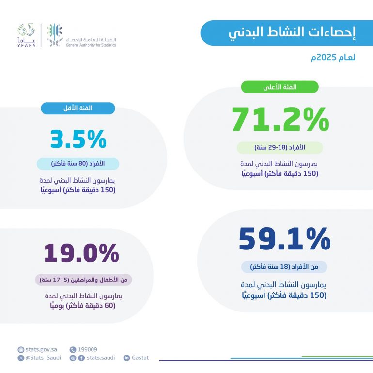 يذكر أن تقديرات نشرة إحصاءات النشاط البدني تستند إلى البيانات المُبلّغة ذاتيًا من الأفراد أو مقدمي الرعاية، وتستعرض مؤشرات النشاط البدني من خلال الإبلاغ الذاتي لسكان المملكة البالغين “18 سنة فأكثر” والأطفال والمراهقين “من عمر 5 إلى 17 سنة” وتعتمد دقة البيانات على نتائج المسح الصحي الوطني، ومسح صحة المرأة والطفل لعام 2025م، والتقديرات السكانية من الهيئة العامة للإحصاء لعام 2025م.