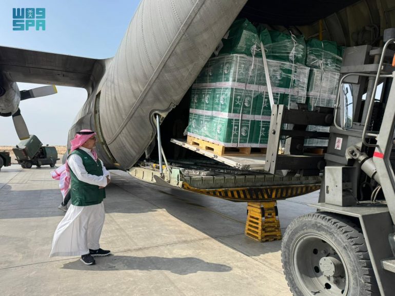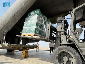وتحمل الطائرة السعودية الـ”71″ على متنها سلالًا غذائية وحقائب إيوائية، تمهيدًا لنقلها إلى المتضررين من الشعب الفلسطيني الشقيق داخل قطاع غزة.