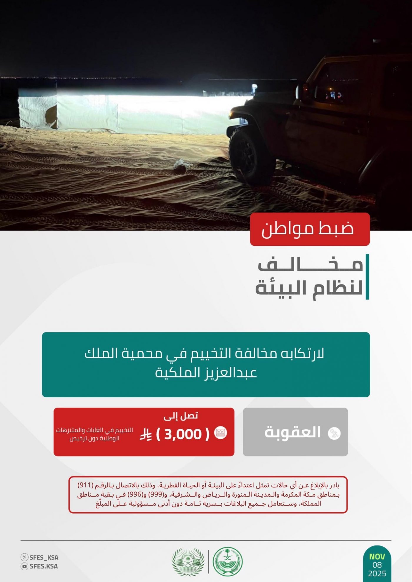 وأوضحت القوات أن عقوبة مخالفة التخييم في الغابات أو المتنزهات الوطنية دون ترخيص غرامة تصل إلى “3,000” ريال، حاثةً على الإبلاغ عن أي حالات تمثل اعتداءً على البيئة أو الحياة الفطرية على الرقم “911” بمناطق مكة المكرمة والمدينة المنورة والرياض والشرقية، و”999″ و”996″ في بقية مناطق المملكة، وستعامل جميع البلاغات بسرية تامة، دون أدنى مسؤولية على المبلّغ.