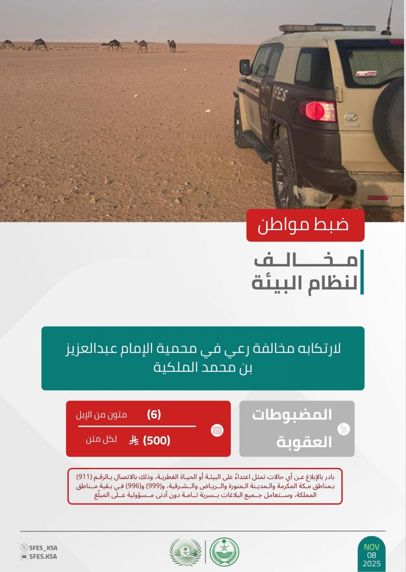 كما ضبطت القوات الخاصة للأمن البيئي مواطنًا مخالفًا لنظام البيئة، لارتكابه مخالفة رعي (6) أمتان من الإبل في مواقع محظور الرعي فيها في محمية الإمام عبدالعزيز بن محمد الملكية، وتم تطبيق الإجراءات النظامية بحقه. وأكّدت القوات أن عقوبة رعي الإبل غرامة (500) ريال لكل متن.
