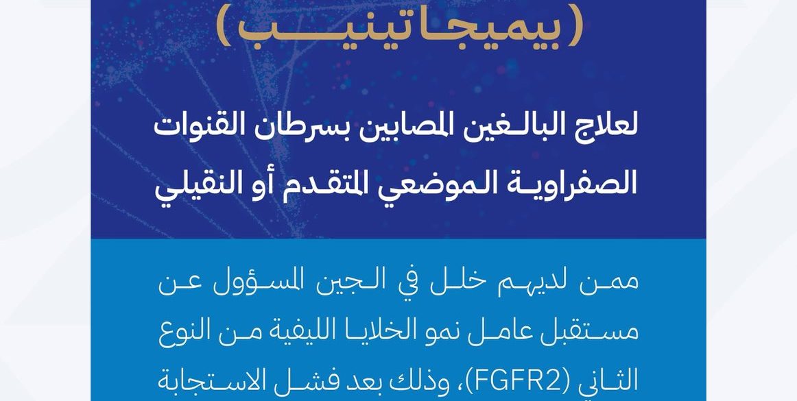 أعلنت الهيئة العامة للغذاء والدواء اعتماد مستحضر بيمازير (بيميجاتينيب) كعلاج أحادي للبالغين المصابين بسرطان القنوات الصفراوية الموضعي المتقدم أو النقيلي، ممن لديهم خلل في الجين المسؤول عن مستقبل عامل نمو الخلايا الليفية من النوع الثاني (FGFR2)، وذلك بعد فشل الاستجابة لخط علاجي سابق على الأقل.