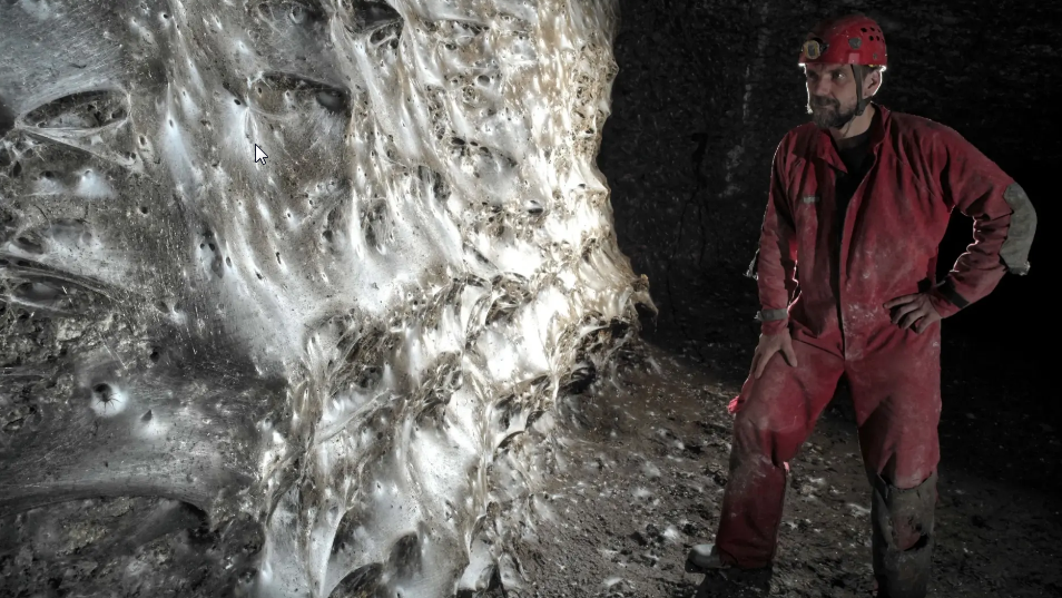 وتُظهر الصور أزاءً من هذه الشبكة الهائلة متشبثة على جدار يشبه ستارة مخملية سوداء ثقيلة في أعماق الكهف على الحدود اليونانية الألبانية، على مرأى من أحد العلماء المزود تجهيزات أشبه بما يحمله عادة