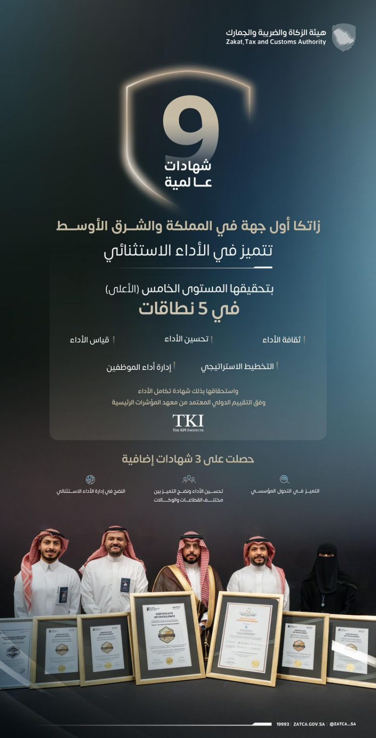 حصلت هيئة الزكاة والضريبة والجمارك “زاتكا” على 9 شهادات عالمية في مجال إدارة الأداء، من بينها شهادة في تكامل الأداء Integrated Performance لتحقيقها المستوى الخامس (الأعلى) في جميع نطاقات التقييم، كأول جهة في المملكة والشرق الأوسط تحصل على شهادة في تكامل الأداء وفق التقييم الدولي المعتمد Global Performance Audit Unit من معهد المؤشرات الرئيسية The KPI Institute.