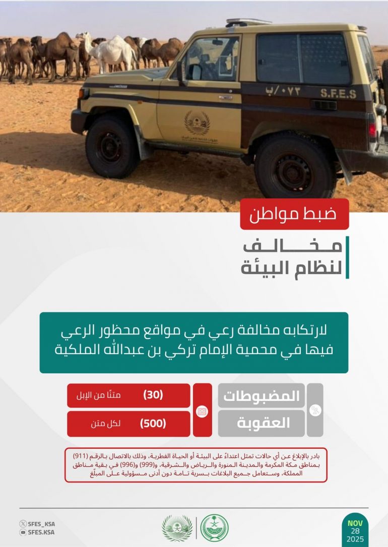 الرعي فيها في محمية الإمام تركي بن عبدالله الملكية، وتم تطبيق الإجراءات النظامية بحقه. وأكدت القوات أن عقوبة رعي الإبل غرامة (500) ريال لكل متن.