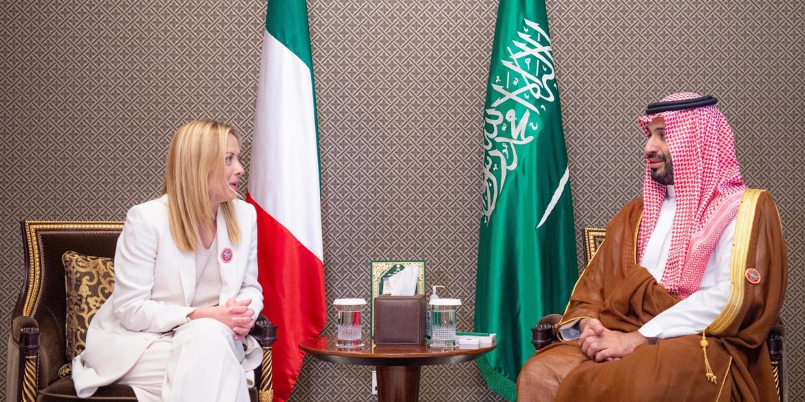 التقى صاحب السمو الملكي الأمير محمد بن سلمان بن عبدالعزيز آل سعود ولي العهد رئيس مجلس الوزراء، في العاصمة البحرينية المنامة اليوم، دولة السيدة جورجيا ميلوني رئيسة وزراء جمهورية إيطاليا، وذلك على هامش أعمال الدورة الـ 46 للمجلس الأعلى لمجلس التعاون لدول الخليج العربية.