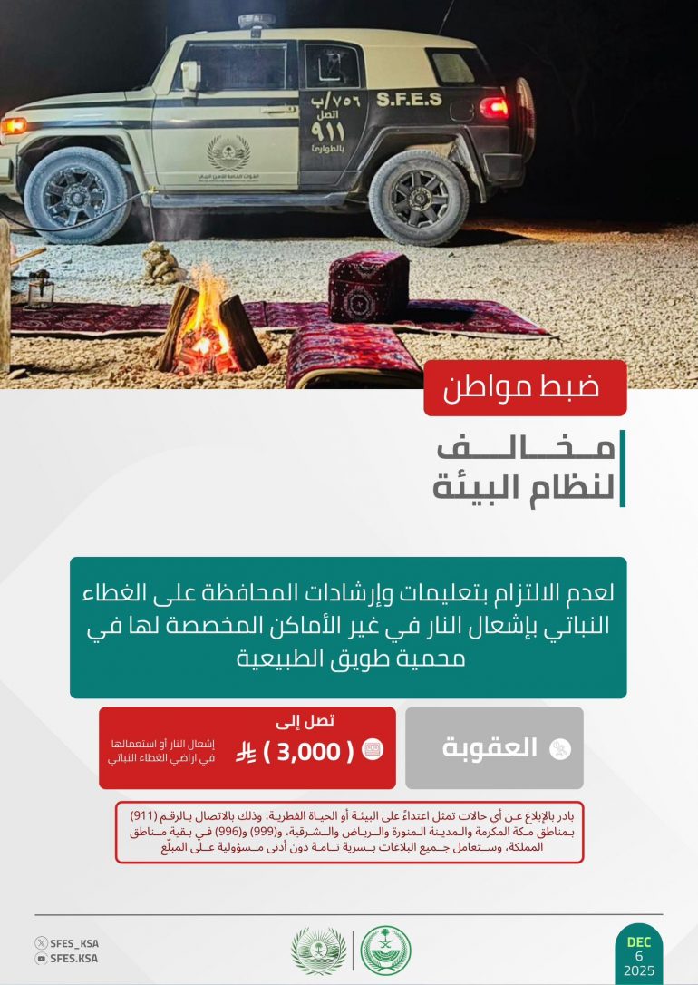 بإشعال النار في غير الأماكن المخصصة لها في محمية طويق الطبيعية، وطُبّقت الإجراءات النظامية بحقه. وأكدت القوات أن عقوبة إشعال النار في غير الأماكن المخصصة لها في الغابات والمتنزهات الوطنية غرامة تصل إلى (3,000) ريال.