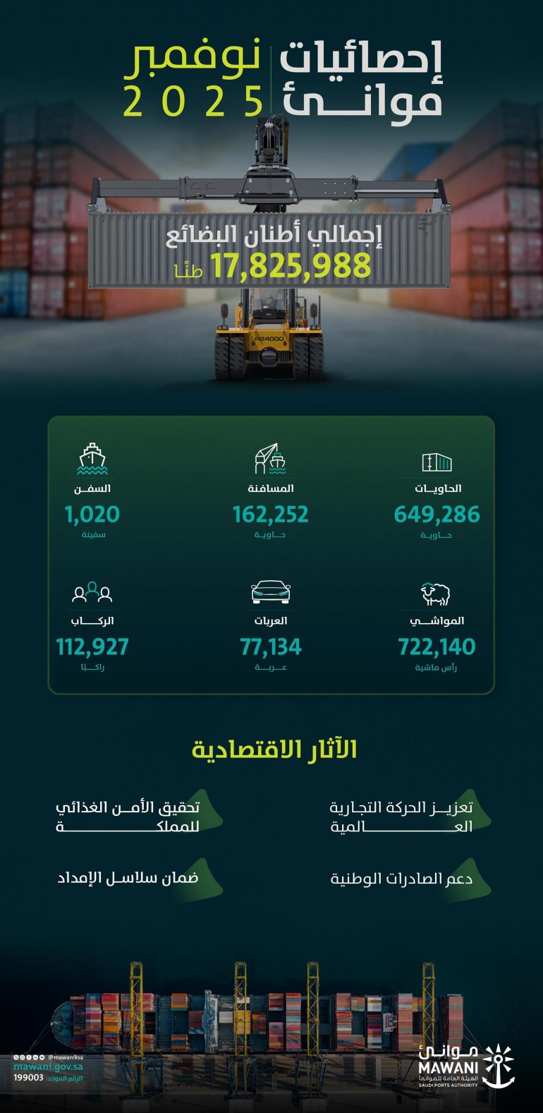 حققت الموانئ التي تشرف عليها الهيئة العامة للموانئ خلال شهر نوفمبر لعام 2025م ارتفاعًا في إجمالي الطنيات المناولة “البضائع العامة، والبضائع السائبة الصلبة، والبضائع السائبة السائلة” بنسبة 0.21%، لتصل إلى 17,825,988 طنًا مقارنة بـ17,788,247 طنًا بالفترة المماثلة من العام الماضي 2024م، وبلغ إجمالي البضائع العامة 1,193,795 طنًا، والبضائع السائبة الصلبة 4,021,286 طنًا، والبضائع السائبة السائلة 12,610,907 طنًا.