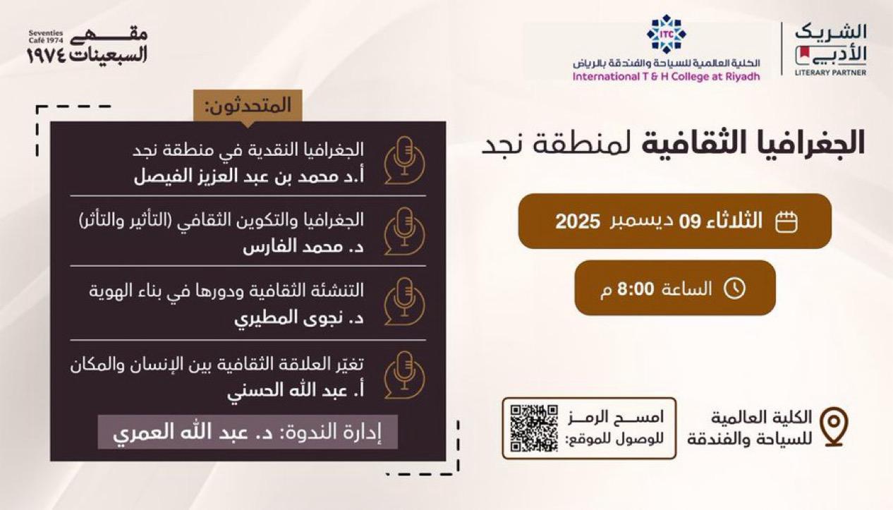 يلقي الأستاذ الدكتور: محمد بن عبدالعزيز الفيصل، الأستاذ بكلية اللغة العربية وعميدها الأسبق، وميد التحرير للشؤون الثقافية، محاضرة بعنوان: “الجغرافيا النقدية لمنطقة نجد”، مساء اليوم بمقر مسرح الكلية العالمية للسياحة والفندقة، وبتنظيم مقهى السبعينيات، ضمن مبادرة الشريك الأدبي.